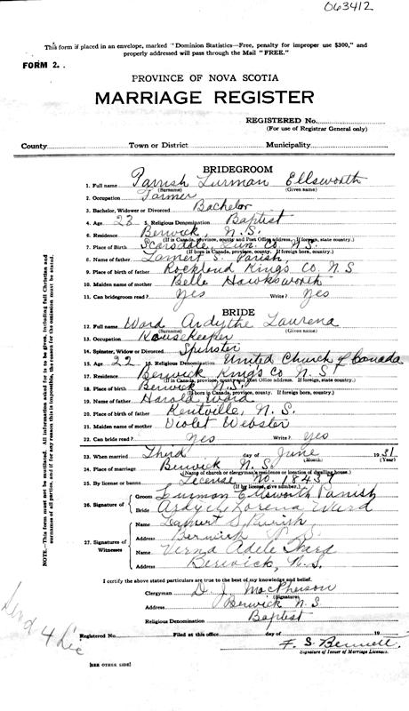 Parents Father: WARD, Harold Clark Mother: WEBSTER, Violet Mary Birth Born on January 03, 1909 in Berwick, Kings Co., NS Death Died on August 01, 1946 in Berwick, Kings Co., NS Buried in Berwick Cemetery in Berwick, Kings Co., NS Marriages PARRISH, Lurman Ellsworth Married on June 03, 1931 in Berwick, Kings Co., NS Notes Death: Valvular Heart Disease Sources Nova Scotia Deaths: Year 1946 Pg. 5016 Images Ardyth Ward Birth Ardyth (Ward) Parrish Death Lurman Parrish Marriage
