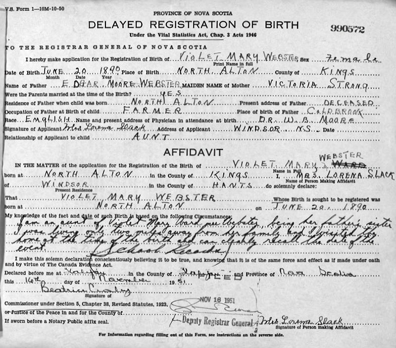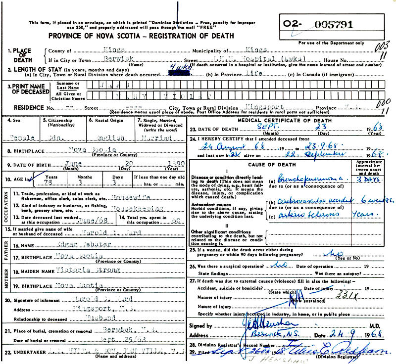 Birth Born on June 20, 1890 in North Alton, Kings Co., NS Death Died on September 23, 1968 in Berwick, Kings Co., NS Buried in Berwick Cemetery in Berwick, Kings Co., NS Marriages WARD, Harold Clark Married on January 23, 1908 in Coldbrook, Kings Co., NS Children WARD, Ardyth Lorena: January 03, 1909 - August 01, 1946 Notes Death: Bronchopneumonia/ Cerebral Vascular Accident Sources Nova Scotia Deaths: Year 1968 #5791 Images Violet Webster Birth Violet (Webster) Ward Death Harold Ward Marriage