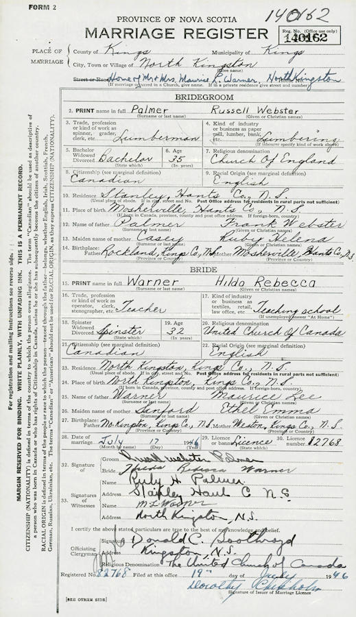 Parents Father: PALMER, Frank Webster Mother: CASEY, Ruby Helena Birth Born on September 02, 1911 in Mosherville, Hants Co., NS Death Died on 1978 in Hants Co., NS Buried in Saint Stephen's Anglican Church Cemetery in Stanley, Hants Co., NS Marriages WARNER, Hilda Rebecca Married on July 17, 1946 in North Kingston, Kings Co., NS Children PALMER, Joy Notes Occupation: Lumberman Sources Hants Cemeteries: Saint Stephen's Anglican Church Cemetery Stanley,NS Images Russell Palmer Birth Russell & Hilda (Warner) Palmer Russell Palmer Marriage