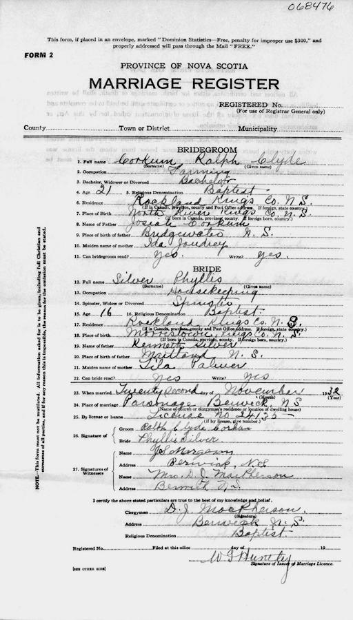 Parents Father: SILVER, Kenneth Nathan Mother: PALMER, Lila Mae Birth Born on June 22, 1916 in Morristown, Kings Co., NS Death Died on May 15, 2005 in Kentville, Kings Co., NS Buried in Berwick Cemetery in Berwick, Kings Co., NS Marriages CORKUM, Ralph Clyde Married on November 22, 1932 in Berwick, Kings Co., NS Children CORKUM, Aubrey CORKUM, Thomas CORKUM, George CORKUM, Gerald CORKUM, Grace CORKUM, Gertrude CORKUM, Betty CORKUM, Myrtle Sharron CORKUM, Marie CORKUM, Christina CORKUM, Gyneth CORKUM, Hartley Keith: 1939 - May 07, 2010 CORKUM, David John: November 09, 1946 - August 18, 1960 Notes Obituary: CORKUM, Phyllis Lavinia - 88, Berwick, Kings Co., passed away May 15, 2005, in Valley Regional Hospital, Kentville. Born in Morristown, Kings Co., she was a daughter of the late Kenneth and Lila (Palmer) Silver. Surviving are her sons, Hartley (Muriel) Corkum, Berwick; Aubrey (Carolyn) Corkum, Tom (Ruth) Corkum, George (Heather) Corkum, all of Windermere; Gerald (Jackie) Corkum, South Berwick; daughters, Grace Murphy, Truro; Gertrude (Lloyd) Smith, Berwick; Betty (Edwin) McIntyre and Myrtle Allen, both of Upper Gagetown, N.B.; Marie (Wendell) Smith, Swan Creek, N.B.; Christina Corkum, Kentville; 27 grandchildren; 34 great-grandchildren; one great great-granddaughter; brother, Mylon (Dorothy) Silver, Fredericton, N.B.; sister, Gladys (Robert) Connors, Rockland. Besides her parents, she was predeceased by her husband, Ralph C. Corkum; son, David Corkum; daughter, Gyneth Corkum; grandchildren, John Paynter, Cheryl Lee McIntyre; brothers, Kenneth Silver in infancy and Alvin Silver; sisters, Joan Silver in infancy and Olie Silver. Visitation will be held from 7-9 p.m. today with the funeral service at 2 p.m. Wednesday, both in H.C. Lindsay Memorial Chapel, 192 Commercial St., Berwick (902-538-9900), Rev. Murray Shaw officiating. Burial in Berwick Cemetery. Sources Funeral Home: H.C. Lindsay Funeral Home Berwick,NS Obituary May 2005 Images Phyllis Silver Birth Ralph & Phyllis (Silver) & David Corkum Phyllis Silver Marriage