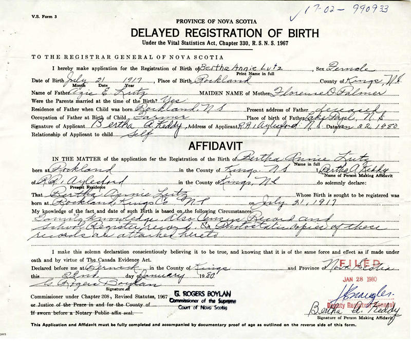 Parents Father: LUTZ, Azie Elvison Mother: PALMER, Florence Odessa Birth Born on July 21, 1917 in Rockland, Kings Co., NS Death Died on March 10, 2014 in Kentville, Kings Co., NS Buried in St. Mary's Anglican Church Cemetery in Auburn, Kings Co., NS Marriages KEDDY, Morris Clyde Married on November 12, 1938 in Berwick, Kings Co., NS Children KEDDY, Brian KEDDY, Stewart KEDDY, Jean: 1940 Notes Obituary: Bertha Annie Keddy - 96, of Aylesford, Kings County, passed away Monday, March 10, 2014 in the Valley Regional Hospital, Kentville. Born in Rockland, Kings County, she was a daughter of the late Azie and Florence (Palmer) Lutz. She worked on the family farm with her husband of 75 years. She had great pride in her children and especially her grandchildren. She was a very special and strong person who always put others before herself. There were very few jobs on the farm that she did not do. She was very active with her chores and hens until she was no longer able. She always appreciated all that was done for her by others and never hesitated to thank them. She is survived by her husband, Morris; she will also be deeply missed by her children, Brian (Linda), Aylesford; Jean Schofield, Bridgewater; Stewart (Beryl), Lower Sackville; grandchildren, Shawn, Jason, Mark, Scott, Charlene and Michael; two great grandchildren; six sisters, Bessie Stoddart, Helen Wilson, Marie Carver, Janice Dunn, Carolyn Schrage and Marina Hudson; four brothers, Carleton Lutz, Hardy Lutz, Ronnie Lutz and Robert Lutz. She was predeceased by four sisters, Carrie Carver, Doris Palmer, Margaret Palmer and Rose Boyd; a brother, Whitney Lutz; son-in-law, Gerald Schofield. Visitation will be held from 7-9 p.m. Friday, March 14, 2014 in Christ Anglican Church Hall, Berwick. The funeral service, followed by a reception, will be held at 2:00 p.m. Saturday, March 15, 2014 in Christ Anglican Church, Berwick, Reverend Ruby Carter officiating. A private family burial will take place in the Auburn Cemetery. Family flowers only, by request. Donations in memory may be made to the charity of your choice. The family wishes to express our sincere thanks to the V.O.N. Continuing Care Home Care, the staff of the Valley Regional Hospital, Dr. Dickson, Dr. George, the Red Cross and all those who visited, brought food and helped in any way. We are deeply grateful. Funeral arrangements have been entrusted to the White Family Funeral Home and Cremation Services, Kentville. Sources Funeral Home: White Family Funeral Home Kentville,NS Obituary March 2014 Images Bertha Lutz Birth Morris & Bertha (Lutz) Keddy Bertha Lutz Marriage Bertha Lutz