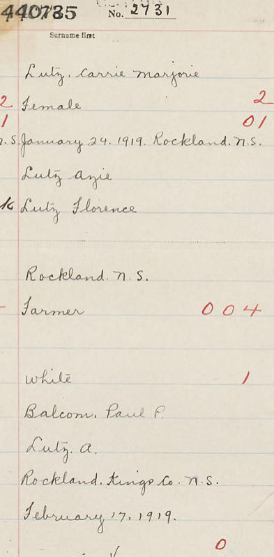 Parents Father: LUTZ, Azie Elvison Mother: PALMER, Florence Odessa Birth Born on January 24, 1919 in Rockland, Kings Co., NS Death Died on 2006 in Kings Co., NS Buried in Morristown Cemetery in Morristown, Kings Co., NS Marriages CARVER, Wilfred Laurence Married on March 15, 1941 in Berwick, Kings Co., NS Children CARVER, Diane CARVER, Glendon W.: 1941 Sources Kings Cemetery Records: Morristown Cemetery Morristown,NS Images Carrie Lutz Birth Wilfred & Carrie (Lutz) Carver Carrie Lutz Marriage