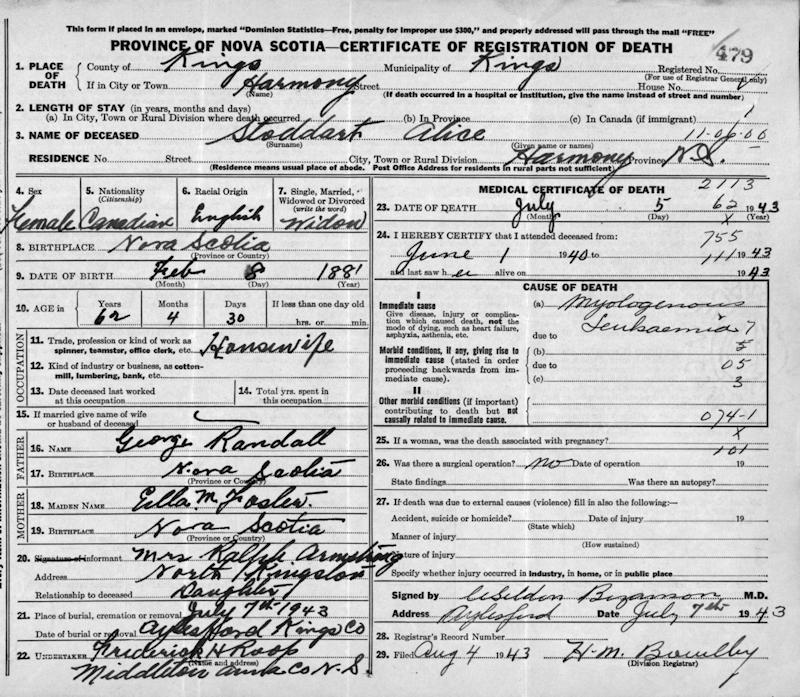 Birth Born on February 08, 1881 in Aylesford, Kings Co., NS Death Died on July 05, 1943 in Harmony, Kings Co., NS Buried in Aylesford Union Cemetery in Aylesford, Kings Co., NS Marriages STODDART, Milford Clayton Married on August 25, 1907 in Annapolis Co., NS Children STODDART, Maurice Randall: July 18, 1917 - 1967 Notes Death: Myologenous Leukemia Sources Nova Scotia Deaths: Book 208 Pg. 479 Images Milford & Alice (Randall) Stoddart Alice (Randall) Stoddart Death Milford Stoddart Marriage