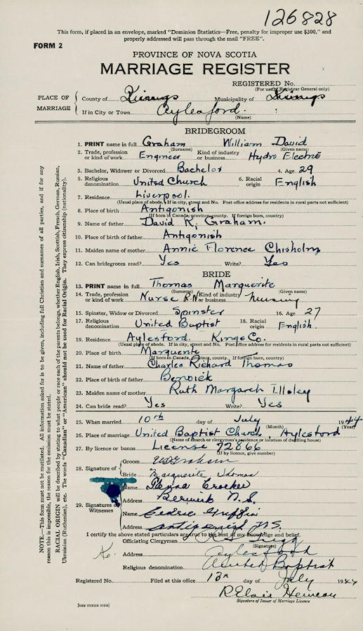 Parents Father: THOMAS, Charles Richard Mother: ILLSLEY, Ruth Margaret Birth Born on November 29, 1916 in Aylesford, Kings Co., NS Marriages GRAHAM, William David Married on July 10, 1944 in Aylesford, Kings Co., NS Notes Occupation: Registered Nurse Images Marguerite Thomas Birth Marguerite Thomas Marriage