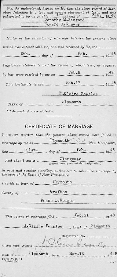Parents Father: SANFORD, Carl Shaw Mother: WOOD, Lora Low Birth Born on May 22, 1921 in Halifax, Halifax Regional Municipality, NS Death Died on November 25, 2016 in Chittenden Co., VT Buried in Flat Cemetery in West Bethel, Oxford Co., ME Marriages GROVER, Howard Arthur Married on February 21, 1948 in Plymouth, Grafton Co., NH Children GROVER, Roberta Jean: November 12, 1948 Notes Occupation: Telephone Operator Obituary: Dorothy M. Grover Age: 95 Dorothy M. Grover 95, passed away after a short illness on November 25, 2016. She lived a very active and full life, surrounded by her loving family.Visiting Hours will be on Tuesday, November 29, from 3-5 PM at the Corbin & Palmer Funeral Chapel, 9 Pleasant Street, Essex Jct,VT.Private Services will be held in Maine at the convenience of the family. In lieu of flowers, memorial contributions may be made to the Appalachian Mountain Club, 5 Joy Street, Boston MA, 02108, noting for the exclusive benefit of Cold River Camp. Sources Newspaper Obituary: Burlington Free Press Burlington,VT July 25,2016 Images Howard & Dorothy (Sanford) Grover Dorothy Sanford Marriage1 Dorothy Sanford Marriage Dorothy Grover