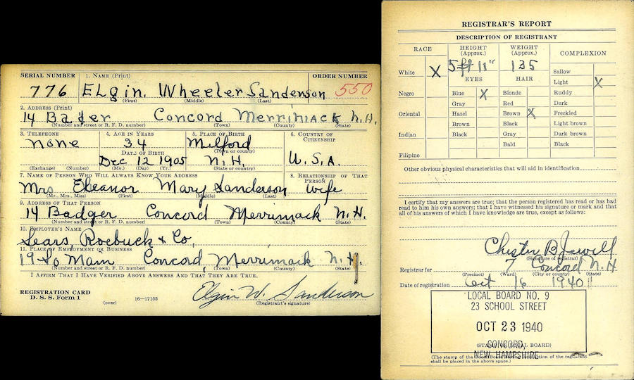 Birth Born on December 12, 1905 in Milford, Hillsborough Co., NH Death Died on August 08, 1965 in Concord, Merrimack Co., NH Buried in Blossom Hill Cemetery in Concord, Merrimack Co., NH Marriages NICHOLS, Eleanor Mary Married on June 30, 1930 in Woodsville, Grafton Co., NH Children SANDERSON, Shirley A.: July 07, 1936 SANDERSON, Robert Elgin: August 31, 1941 - August 07, 2015 Notes Occupation: Employee at Sears,Roebuck & Co./ Salesman Death: Carcinoma of Pancreas Sources Findagrave.com: https://www.findagrave.com/memorial/276843808/elgin-w-sanderson Images Elgin & Eleanor (Nichols) Sanderson Elgin Sanderson WW2 Draft Eleanor Nichols Marriage