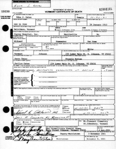 Birth Born on January 23, 1910 in Belvidere, Lamoille Co., VT Death Died on November 02, 2001 in Morrisville, Lamoille Co., VT Buried in Lamoille View Cemetery in Johnson, Lamoille Co., VT Marriages GATES, Elmer Cornelius Married on July 15, 1939 in Johnson, Lamoille Co., VT Children GATES, Jerilyn Jane: April 11, 1943 Notes Death: Carcinoma of Breast Sources Vermont Deaths: #01004185 Images Edna Tatro Birth Elmer & Edna (Tatro) Gates Edna (Tatro) Gates Death Elmer Gates Marriage Edna Tatro Marriage
