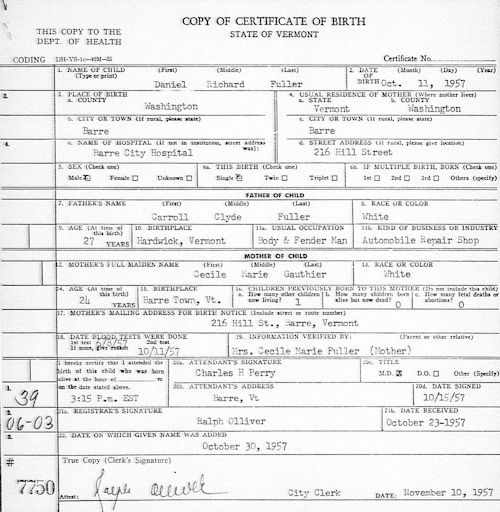 Parents Father: FULLER, Carroll Clyde Mother: GAUTHIER, Marie Jeanne Cecile Birth Born on October 11, 1957 in Barre, Washington Co., VT Images Daniel Fuller Birth