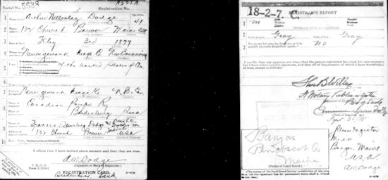 Parents Father: DODGE, George Washington Mother: DICKSON, Augusta Sophia Birth Born on February 03, 1877 in Nauwigewauk, Kings Co., NB Death Died on 1941 in Brewer, Penobscot Co., ME Buried in Oak Hill Cemetery in Brewer, Penobscot Co., ME Marriages SPURLING, Frances C. Married on September 16, 1903 in Brewer, Penobscot Co., ME Children DODGE, Frances M.: 1913 Notes Occupation: Canadian Pacific Railroad Telegraph Operator Sources Findagrave.com: http://www.findagrave.com/cgi-bin/fg.cgi?page=gr&GRid=88108622 Images Arthur W. Dodge Arthur W. Dodge WW1 Draft Arthur W. Dodge Marriage