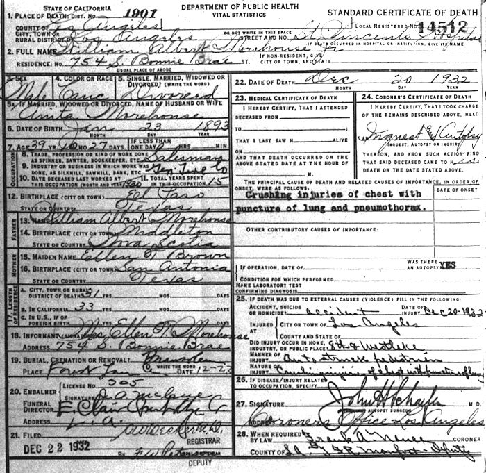 Parents Father: MOREHOUSE, William Albert Mother: BROWN, Ellen Teresa Birth Born on January 23, 1892 in El Paso, El Paso Co., TX Death Died on December 20, 1932 in Los Angeles, Los Angeles Co., CA Buried in Forest Lawn Memorial Park in Glendale, Los Angeles Co., CA Marriages PROVARD, Anita Married on July 01, 1913 in Chicago, Cook Co., IL Children MOREHOUSE, Marjorie Xenia: August 29, 1915 - September 01, 1956 Notes Occupation: Clerk - Goodyear Tire & Rubber Co./ Salesman General Tire Co. Death: Accident - Struck By Automobile - Crushing of chest with puncture of lung & pneumothorax Sources California Deaths: #14512 California Cemeteries: Forest Lawn Memorial Park Glendale,CA Plot: Sanct. of Gratitude, GM, Memorial Terrace, Lot 0, Space 5977 Images William A. Morehouse Jr William A. Morehouse Jr Death William Morehouse Jr. WW1 Draft William A. Morehouse Jr