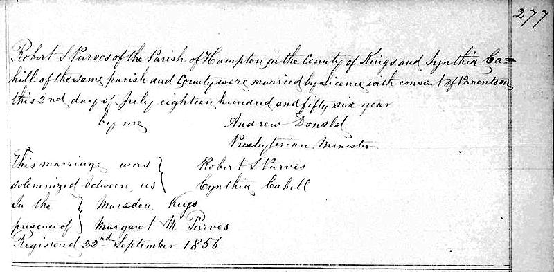 Birth Born on 1836 in Hampton, Annapolis Co., NS Death Died on June 14, 1883 in Nauwidgewauk, Kings Co., NB Buried in St. Andrews Kirk United Church Cemetery in Hammond River, Kings Co., NB Marriages PURVES, Robert Swinton Married on July 02, 1856 in Hampton, Kings Co., NB Children PURVES, Laura Almira: May 16, 1857 - November 17, 1924 PURVES, Minnie Amelia: 1859 - August 25, 1877 PURVES, Margaret Keyes: 1860 - March 09, 1884 PURVES, Carrie Bell: 1863 - August 28, 1865 PURVES, Norman Rulofson: October 29, 1865 - February 24, 1956 PURVES, Lillian Vincent: May 18, 1868 - February 10, 1950 PURVES, Berton Hanford: 1872 - September 24, 1882 PURVES, Clara Isabella: 1876 - October 31, 1876 Notes Obituary: d. Nauwidgewauk (Kings Co.) 14th inst., Cynthia PURVES w/o Robert S. PURVES, age 47. Funeral Saturday 2 o'clock. Sources Newspaper: The Daily Telegraph Saint John,NB Jun 16,1883 Images Robert & Cynthia (Cahill) Purves Robert Purves Marriage