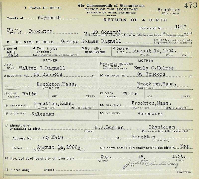 Parents Father: BAGNELL, Walter Cushman Mother: HOLMES, Emily Gertrude Birth Born on August 14, 1922 in Brockton, Plymouth Co., MA Death Died on June 23, 2000 in Lake Worth, Palm Beach Co., FL Marriages ANNIS, Beverly M. Children BAGNELL, Bruce Warren: 1943 - March 29, 1948 BAGNELL, Cheryl Emily: April 20, 1945 BAGNELL, Gregory F.: September 30, 1946 BAGNELL, Walter Clark: January 15, 1949 - June 16, 2009 BAGNELL, Douglas: August 07, 1953 Notes Military Service: WW2 US Army Occupation: Automobile Salesman Sources Newspaper Obituary: The Palm Beach Post June 28,2000 Obituary Images George H. Bagnell Birth