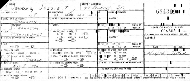 Parents Father: TABER, James Allan Mother: FOWNES, Ella Marilla Birth Born on August 08, 1896 in St. Martin's, Saint John Co., NB Death Died on May 05, 1984 in Seal Beach, Orange Co., CA Marriages JENKINS, Harold Willey Children JENKINS, Lawrence T.: November 11, 1919 - September 14, 2008 JENKINS, Robert Taber: May 26, 1924 Images Jessie L. Taber Birth