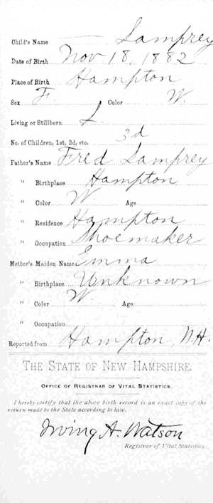 Birth Born on November 18, 1882 in Hampton, Rockingham Co., NH Death Died on 1926 Marriages MOIR, Charles Christopher Walton Married on December 11, 1909 in Providence, Providence Co., RI Children MOIR, Clifford Lamprey: June 14, 1911 - 1974 MOIR, Ruth Emma: February 28, 1913 - 1980 Images Laura Lamprey Birth Charles Moir Marriage