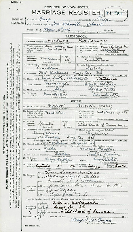 Parents Father: MACKENZIE, Charles Whitney Mother: SHAW, Gladys Ruth Birth Born on February 20, 1921 in Montrose, Colchester Co., NS Death Died on January 11, 1975 in Kings Co., NS Buried in Willow Bank Cemetery in Wolfville, Kings Co., NS Marriages FULLER, Gertrude Isabel Married on September 30, 1946 in Hortonville, Kings Co., NS Notes Occupation: Taxi Owner - Mechanic Sources Kings Cemetery Records: Willow Bank Cemetery Wolfville,NS Images Ross MacKenzie Birth Ross & Gertrude (Fuller) MacKenzie Ross MacKenzie Marriage