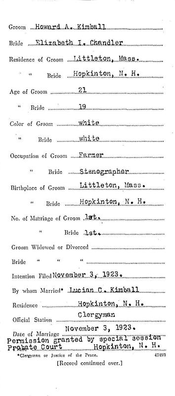 Parents Father: KIMBALL, Walter Mother: MACKINLEY, Mabel Olive Birth Born on October 28, 1902 in Littleton, Middlesex Co., MA Death Died on August 28, 1987 in Fitchburg, Worcester Co., MA Buried in Westlawn Cemetery in Littleton, Middlesex Co., MA Marriages CHANDLER, Elizabeth Irene Married on November 03, 1923 in Hopkinton, Merrimack Co., NH Children KIMBALL, Dorothy Mabel: September 28, 1924 - October 19, 2008 KIMBALL, Douglas Howard: May 10, 1926 - June 08, 1996 KIMBALL, Dexter Chandler: August 05, 1927 - July 03, 2008 KIMBALL, David Miller: December 05, 1928 - January 09, 2004 KIMBALL, Donald A.: November 28, 1930 - October 11, 2000 KIMBALL, Dean Walter: November 12, 1935 - August 02, 2012 Notes Occupation: Dairy Farmer Sources Massachusetts Deaths: #040237 Images Howard Kimball Birth Howard & Elizabeth (Chandler) Kimball Howard Kimball Marriage