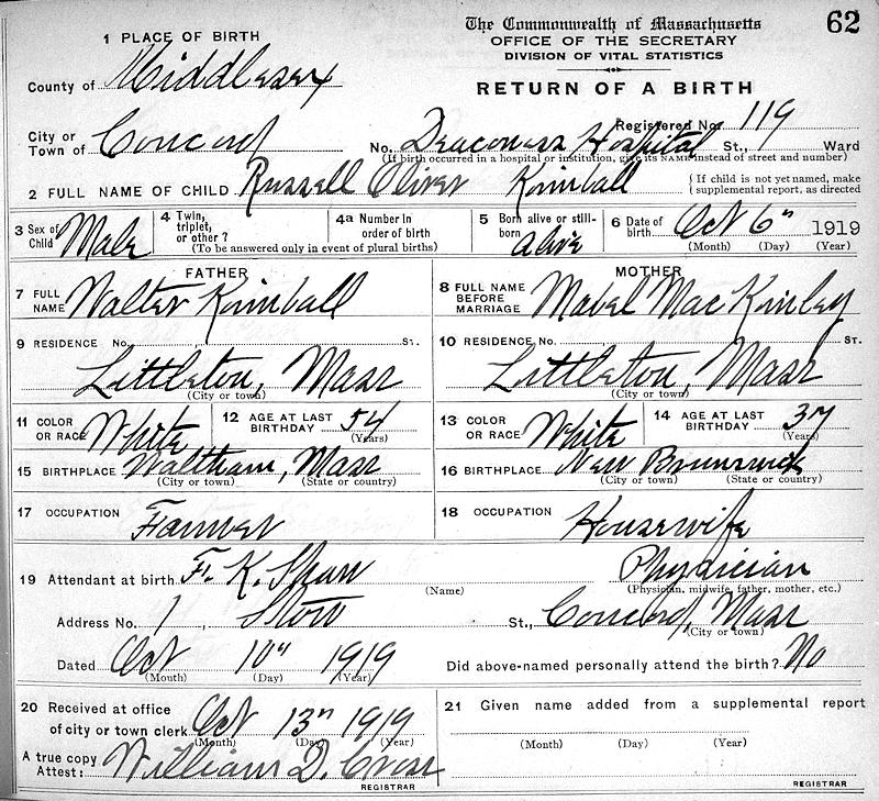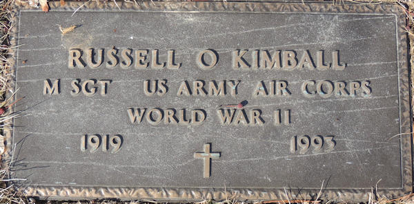 Parents Father: KIMBALL, Walter Mother: MACKINLEY, Mabel Olive Birth Born on October 06, 1919 in Concord, Middlesex Co., MA Death Died on January 31, 1993 in Concord, Middlesex Co., MA Buried in Westlawn Cemetery in Littleton, Middlesex Co., MA Marriages OGILVIE, Ruth Virginia Children KIMBALL, Mary Lorraine: October 05, 1942 - May 02, 2007 KIMBALL, Brenda: August 23, 1948 KIMBALL, Russell Ryne: April 20, 1951 KIMBALL, Cheryl Ann: April 11, 1956 - June 13, 2020 Notes Military Service: WW2 US Army Air Corps Master Sergeant Sources Massachusetts Deaths: #013699 Images Russell Kimball Birth Russell Kimball
