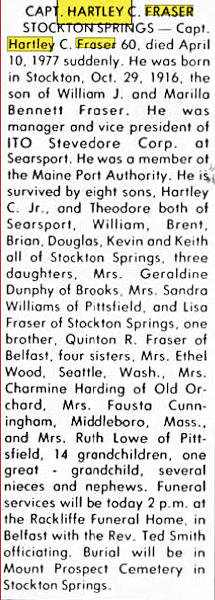 Parents Father: FRASER, William John Mother: BENNETT, Marilla Jane Birth Born on April 29, 1916 in Stockton Springs, Waldo Co., ME Death Died on April 10, 1977 in Belfast, Waldo Co., ME Buried in Mount Prospect Cemetery in Stockton Springs, Waldo Co., ME Marriages RUSS, Marie Ellen Married on January 16, 1937 in Belfast, Waldo Co., ME Children FRASER, Lisa FRASER, Keith G. FRASER, Kevin FRASER, Hartley Clair: March 24, 1936 - January 27, 2004 FRASER, William J.: August 02, 1938 - February 18, 2017 FRASER, Geraldine Marie: March 08, 1941 - July 23, 2016 FRASER, Theodore Clair: December 04, 1943 - March 31, 1944 FRASER, Clair Theodore: May 06, 1945 FRASER, Sandra L.: May 09, 1946 - April 06, 2006 FRASER, Brent R.: December 01, 1949 FRASER, Brian E.: July 01, 1960 FRASER, Kurt Douglas: January 03, 1962 Notes Occupation: Stevedore/ Manager & Vice President ITO Stevedore Corp. Sources Maine Deaths: #7703114 Images Hartley Fraser Hartley Fraser Obit Bangor Daily News Bangor,ME Apr 13,1977 Hartley Fraser Obit Bangor Daily News Bangor,ME Apr 13,1977