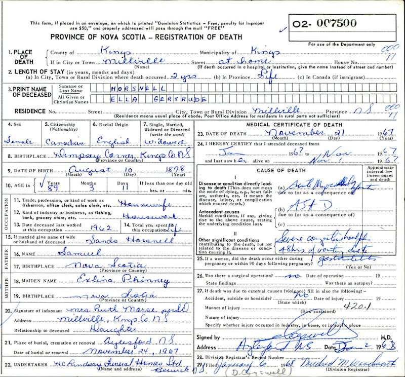 Parents Father: BOWLBY, Samuel Mother: PHINNEY, Exalina Fayette Birth Born on August 10, 1878 in Dempsey Corner, Kings Co., NS Death Died on November 21, 1967 in Millville, Kings Co., NS Buried in Aylesford Union Cemetery in Aylesford, Kings Co., NS Marriages HORSNELL, Charles Sans Married on December 29, 1897 in Aylesford, Kings Co., NS Children HORSNELL, Wilfred Freeman: December 13, 1900 - January 07, 1979 HORSNELL, Harry Lewis: October 07, 1905 - December 06, 1978 HORSNELL, Ruth Muriel: November 15, 1913 - October 07, 2000 HORSNELL, Cynthia Pauline: July 19, 1915 - November 06, 1955 Notes Death: Acute Myocardial Infarction Sources Kings Cemetery Records: Aylesford Union Cemetery Nova Scotia Deaths: Year 1967 #7500 Images Ella (Bowlby) Horsnell Death Ella Bowlby Marriage