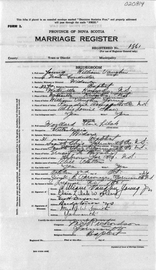 Birth Born on May 08, 1893 in South Ohio, Yarmouth Co., NS Death Died on December 02, 1979 in Waterville, Kings Co., NS Buried in Berwick Cemetery in Berwick, Kings Co., NS Marriages YOUNG, William Von Tromp Married on October 02, 1924 in Yarmouth, Yarmouth Co., NS Sources Findagrave.com: https://www.findagrave.com/memorial/258578693/elsie_lilah-young Images William & Elsie (Wollard) Young William Young Jr Marriage2