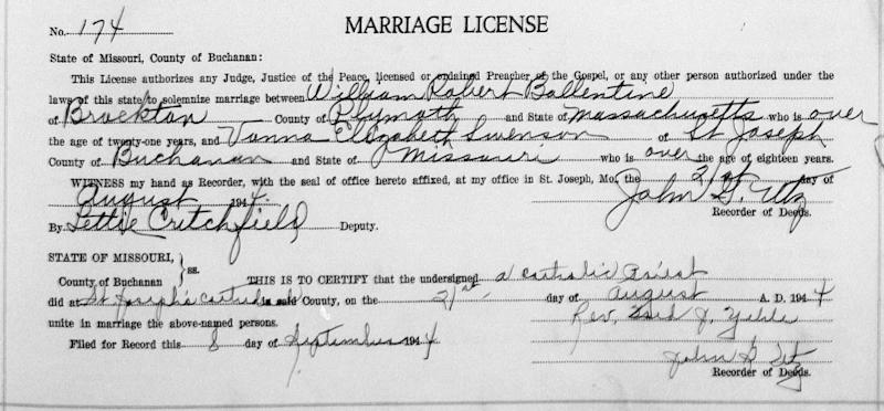 Birth Born on August 17, 1923 in Saint Joseph, Buchanan Co, MO Death Died on June 07, 2008 in San Antonio, Bexar Co., TX Buried in Mount Olivet Cemetery in Saint Joseph, Buchanan Co, MO Marriages BALLENTINE, William Robert Married on August 21, 1944 in Saint Joseph, Buchanan Co, MO Children BALLENTINE, William Harry: November 24, 1946 - May 14, 2011 BALLENTINE, David Robert: September 20, 1950 Images Vonna (Swenson) Ballentine William R. Ballentine Marriage