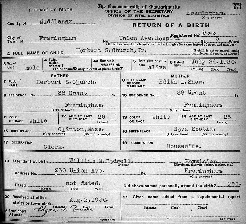 Parents Father: CHURCH, Herbert Stephen Mother: SHAW, Edith Louise Birth Born on July 24, 1920 in Framingham, Middlesex Co., MA Death Died on January 28, 2007 in Arlington Heights, Cook Co., IL Buried in Saint Michael The Archangel Catholic Cemetery in Palatine, Cook Co., IL Marriages ORZECH, Carol S. Children CHURCH, Carolyn Louise: February 06, 1946 CHURCH, David J.: January 03, 1950 CHURCH, Kathryn M.: January 17, 1952 CHURCH, Virginia A.: September 22, 1956 CHURCH, Patricia E.: August 21, 1959 Notes Occupation: Assistant Superintendant/ Project Manager/ Vice President Turner Construction Obituary: Herbert S. Church Jr. of Arlington Heights A Mass for Herbert S. Church Jr., 86, will be celebrated at 9:30 a.m. Thursday, at Our Lady of the Wayside Church, 432 S. Mitchell St., Arlington Heights. Interment will be in St. Michael the Archangel Cemetery, Palatine. Born July 24, 1920, in Framingham, Mass., he died Sunday, Jan. 28, 2007, at home. Mr. Church was a veteran of World War II, serving in the Navy. He was the vice president and general manager of Turner Construction's Chicago territory. He started with the company in 1943, when he graduated from Northeastern University with a degree in civil engineering. He retired in 1985. He had served in a wide range of positions with the company including field positions, construction project manager and general superintendent. In the Chicago territory, he was active in the construction industry's sponsorship of the Boy Scouts and Girl Scouts. He received the Good Scout Award in 1971, in recognition of his scouting activities. He was also a member of the Union League of Chicago, the Economic Club of Chicago and the Inverness Club of Palatine. He was instrumental in the remodeling of the Horizon Children's Center in 1997. He was director of the Builders Association of Chicago. He was the husband of Carol S. (nee Orzech); father of Carolyn (John) Fahey, David (Chary), Kathryn (the late James) Jur, Virginia (Thomas O'Mara) Church and Trish (Vernon Podlasek II) Church-Podlasek; grandfather of 15; great-grandfather of seven; and brother of Marion Nielsen and the late Barbara (Frank) Strange. In lieu of flowers, memorial contributions may be made to the American Cancer Society. Arrangements were made by Meadows Funeral Home, Rolling Meadows, 847-253-0224. Daily Herald Arlington Heights,IL January 31,2007 Military Service: WW2 US Navy Sources US Social Security Index: Numerical ID Files Images Herbert Church Jr Birth Herbert Church Jr