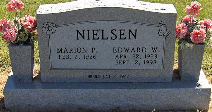 Parents Father: CHURCH, Herbert Stephen Mother: SHAW, Edith Louise Birth Born on February 07, 1926 in Natick, Middlesex Co., MA Death Died on August 05, 2011 in Lexington, Cleveland Co., OK Buried in Lexington Cemetery in Lexington, Cleveland Co., OK Marriages NIELSEN, Edward William Married on October 04, 1947 Children NIELSEN, Marianne Ann: March 29, 1948 NIELSEN, Janice Patricia: March 16, 1951 - October 24, 2012 NIELSEN, Elizabeth Ann: 1953 Notes Obituary: Marion Nielsen, age 85 of Lexington, passed away on August 5, 2011. Marion Priscilla Church was born February 7, 1926, in Natick MA, the baby of three children born to Herbert S. Church and Edith (Shaw) Church. She was raised in Massachusetts, later attending the Wellesley Nursing School where she obtained her Nurses License. Marion met a young serviceman from Framingham MA named Edward W. Nielsen. They fell in love and were married in 1947. Together they raised three daughters, Marianne, Janice, and Elizabeth. Marion genuinely loved her work as a nurse, and she worked in pediatrics for more than 30 years. Her greatest joy, however, was her family; and she took great pride in being a wife, a mother, and eventually a grandmother. Marion "always wanted to do for others" and looked for ways to make life easier. She was a gifted quilter and a member of the Chickasha Quilters Guild and the United Methodist Church. She was preceded in death by her husband Edward Nielsen; parents Herbert and Edith Church; siblings Barbara Strange and Herb Church; and granddaughters Nancy Elizabeth Carter and Heather Margaret Carter. Marion leaves behind her daughters Marianne Carter and husband David of Lexington, Janice LaFreniere of Palm Bay FL, and Elizabeth Bousquet and husband Robert of Wanette OK; granddaughters Jaime LaFreniere and Jennifer LaFreniere; great-grandchildren Jacob, Bryce, Nathan, and Bodie; and a host of other family members and friends. Occupation: Registered Nurse Images Edward & Marion (Church) Nielsen