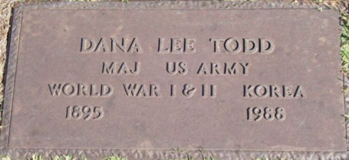 Parents Father: TODD, Harry Coulter Mother: LENEHAN, Carrie E. Birth Born on June 12, 1895 in Calais, Washington Co., ME Death Died on 1988 in Oklahoma City, Oklahoma Co., OK Buried in Memorial Park Cemetery in Oklahoma City, Oklahoma Co., OK Notes Occupation: Oil Investments Military Service: WW1, WW2, Korea US Army Major Images Dana Todd Dana Todd WW1 Draft
