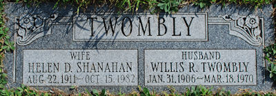 Birth Born on January 31, 1906 in North Conway, Carroll Co., NH Death Died on March 18, 1970 in Lynn, Essex Co., MA Buried in North Conway Cemetery in North Conway, Carroll Co., NH Marriages SHANAHAN, Helen Dorothea Married on December 26, 1937 in North Conway, Carroll Co., NH Children TWOMBLY, James E. TWOMBLY, Patrick Allan: August 31, 1938 - August 21, 1938 TWOMBLY, Patricia Ellen: July 15, 1947 Notes Occupation: Stonecutter Sources Massachusetts Deaths: #010898 Images Willis Twombly Birth Willis & Helen (Shanahan) Twombly Helen Shanahan Marriage