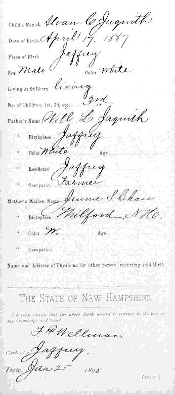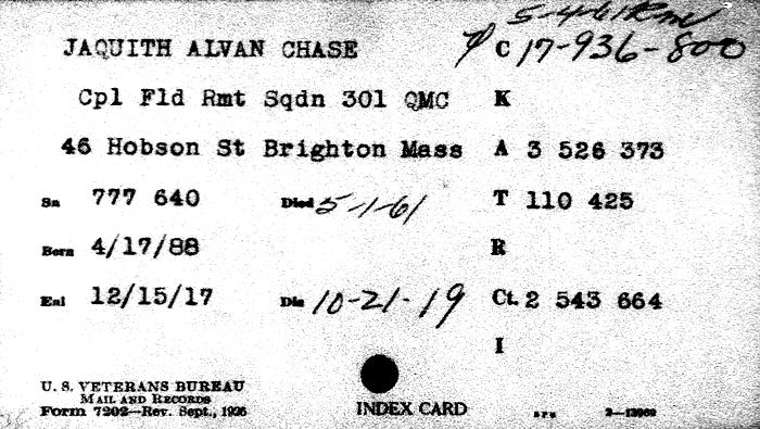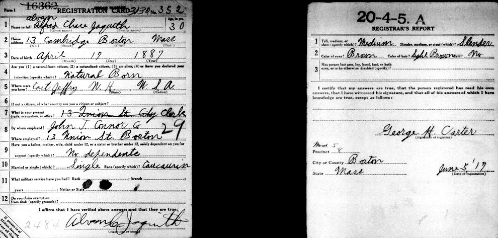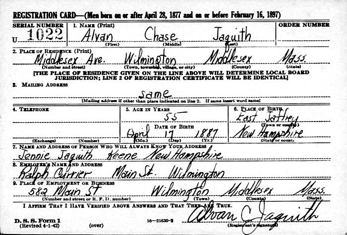 Birth Born on April 17, 1887 in Jaffrey, Cheshire Co., NH Death Died on May 01, 1961 in Massachusetts, USA Buried in Wildwood Cemetery in Wilmington, Middlesex Co., MA Marriages MACKINLEY, Bertha Christine Notes Occupation: Retail Salesman/ Superintendant Groceries/ Owner Dry Goods Store Military Service: WW1 US Army Sources Findagrave.com: https://www.findagrave.com/memorial/84114192/alvan_chase-jaquith Images Alvan Jaquith Birth Alvan Jaquith Alvan Jacquith W1 Draft Alvan Jaquith WW2 Draft Alvan Jaquith Military Service