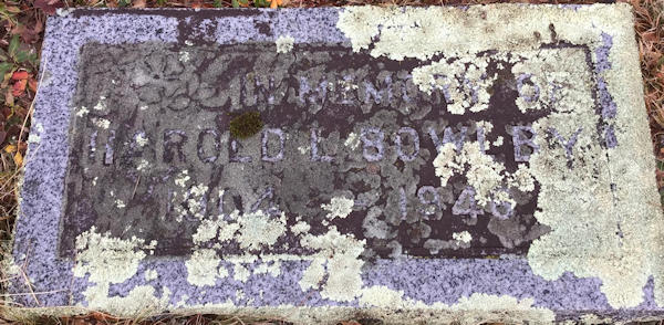 Parents Father: BOWLBY, Howard Elmer Mother: TAYLOR, Lottie Love Birth Born on December 26, 1904 in Aylesford, Kings Co., NS Death Died on March 09, 1946 in Kentville, Kings Co., NS Buried in Aylesford Union Cemetery in Aylesford, Kings Co., NS Marriages ROBBINS, Dora Crosby Married on March 12, 1934 in Pleasant Lake, Yarmouth Co., NS Children BOWLBY, Jon Howard: August 25, 1937 - June 15, 1965 BOWLBY, David Robbins: October 07, 1938 BOWLBY, Donald Harold: August 10, 1940 - February 06, 2018 Notes Occupation: Farmer Death: Renitonitis/ Appendicitis Sources Nova Scotia Deaths: #2773 Images Harold Bowlby Harold Bowlby Death Harold Bowlby Marriage