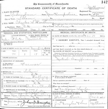 Parents Father: WOODBURY, Hiram Mother: CHURCHILL, Prudence Eliza Birth Born on March 13, 1850 in Salem, Rockingham Co., NH Death Died on December 30, 1920 in Salem Depot, Rockingham Co., NH Buried in Walnut Grove Cemetery in Methuen, Essex Co., MA Marriages WELCH, Emma Esther (Webster) Married on March 10, 1875 in Pelham, Hampshire Co., MA Children WOODBURY, Frederick Ernest: December 31, 1875 - February 23, 1921 WOODBURY, Carrie E.: January 13, 1879 - April 24, 1880 WOODBURY, Mary Ellen: October 01, 1881 - 1971 WOODBURY, Hattie Belle: September 05, 1884 - 1973 Notes Occupation: Stonecutter/ Shoemaker/ Farmer Death: Mitral Insufficency Sources New Hampshire Deaths: Pg. 79 Images Charles & Emma (Welch) & Carrie Woodbury Charles Woodbury Death1 Charles Woodbury Death Charles Woodbury Marriage