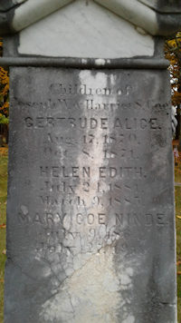 Parents Father: COE, Joseph William Mother: CHURCHILL, Harriet Sophia Birth Born on July 09, 1864 in Durham, Stafford Co., NH Death Died on July 27, 1911 in Fort Wayne, Allen Co., IN Buried in Durham Cemetery in Durham, Stafford Co., NH Marriages NINDE, Daniel Benjamin Married on February 27, 1899 in Brookline, Norfolk Co., MA Children NINDE, David Campbell: June 14, 1910 - August 26, 1986 Notes Death: Myocarditis Sources New Hampshire Deaths: New Hampshire Disinterment Application Images Gertrude & Helen Coe & Mary (Coe) Ninde Mary (Coe) Ninde Disinterment Application Mary Coe Marriage Mary Coe Passport Application