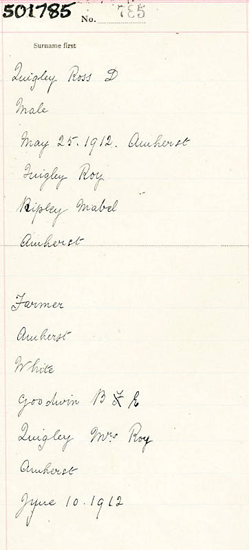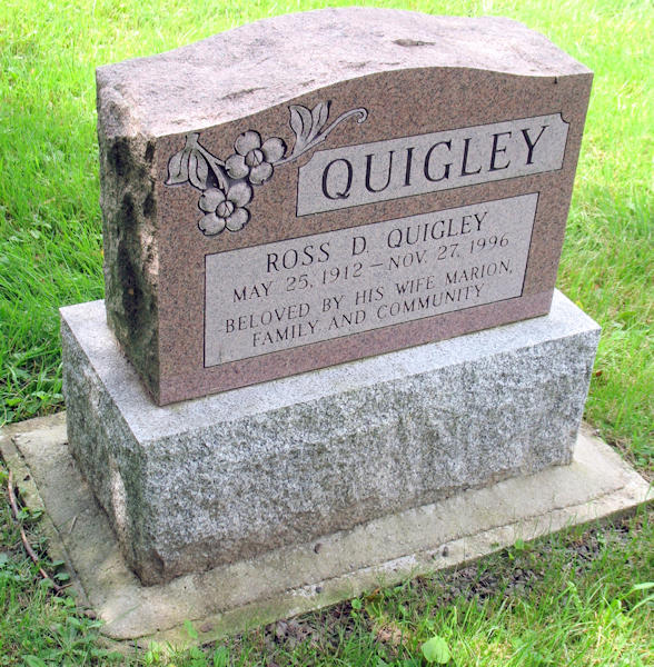 Birth Born on May 25, 1912 in Amherst, Cumberland Co., NS Death Died on November 27, 1996 in Quebec, Canada Buried in Hemmingford Protestant Cemetery in Hemmingford, Monteregie Region, QU Marriages STEVENSON, Marion June Married on November 06, 1931 in Amherst, Cumberland Co., NS Notes Occupation: Farmer Sources Cemetery: Hemmingford Protestant Cemetery Hemmingford,QU Images Ross Quigley Birth Ross Quigley Marion Stevenson Marriage