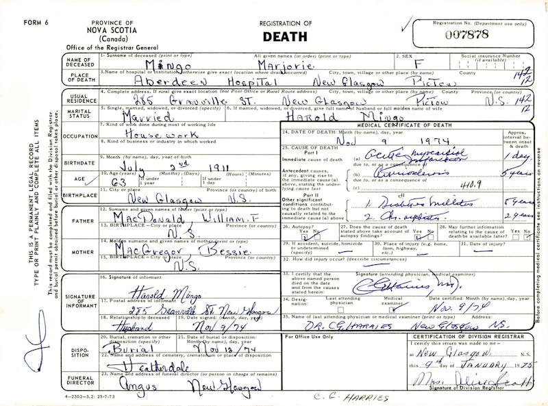 Birth Born on July 02, 1911 in New Glasgow, Pictou Co., NS Death Died on November 09, 1974 in New Glasgow, Pictou Co., NS Buried in Heatherdale Memorial Gardens in Westville, Pictou Co., NS Marriages MINGO, Harold George Married on November 05, 1930 in Stellarton, Pictou Co., NS Children MINGO, Floyd Alexander: 1933 MINGO, Shirley Lorraine: 1936 MINGO, Sandra Elizabeth: 1942 MINGO, Linda Karen: 1947 MINGO, Gray William: 1952 Notes Death: Acute Myocardial Infarction Sources Nova Scotia Deaths: Year 1974 #7878 Images Marjorie (MacDonald) Mingo Death Harold Mingo Marriage