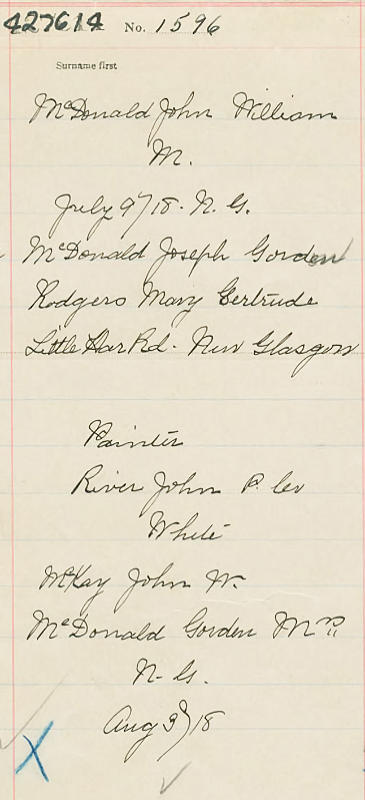 Birth Born on July 09, 1918 in New Glasgow, Pictou Co., NS Death Died on 2000 Buried in Hamilton Cemetery in River John, Pictou Co., NS Marriages MINGO, Grace Olive Married on September 17, 1941 in Middleton, Colchester Co., NS Notes Occupation: Farmer Sources Pictou Cemetery Records: Hamilton Cemetery River John,NS Images John W. MacDonald Birth John W. & Grace (Mingo) MacDonald Grace Mingo Marriage