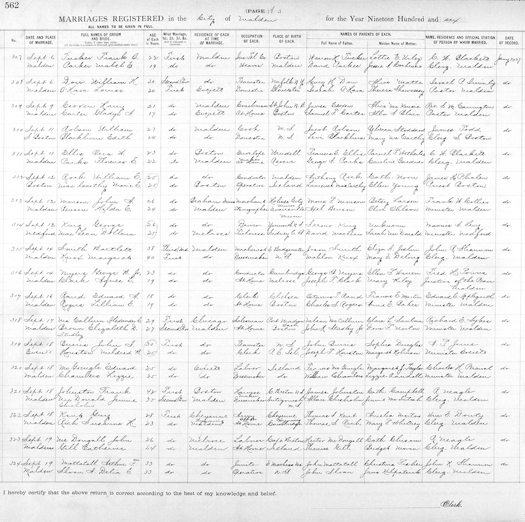 Birth Born on March 30, 1873 in Boundry Creek, Westmorland Co., NB Death Died on October 26, 1955 in North Grafton, Worcester Co., MA Buried in Grafton State Hospital Memorial Cemetery in Shrewsbury, Worcester Co., MA Marriages MATTATALL, Arthur Franklin Married on September 19, 1906 in Malden, Middlesex Co., MA Notes Occupation: Machine Operator Sources Findagrave.com: https://www.findagrave.com/memorial/237353341/adelia-elizabeth-mattatall Images Arthur Mattatall Marriage