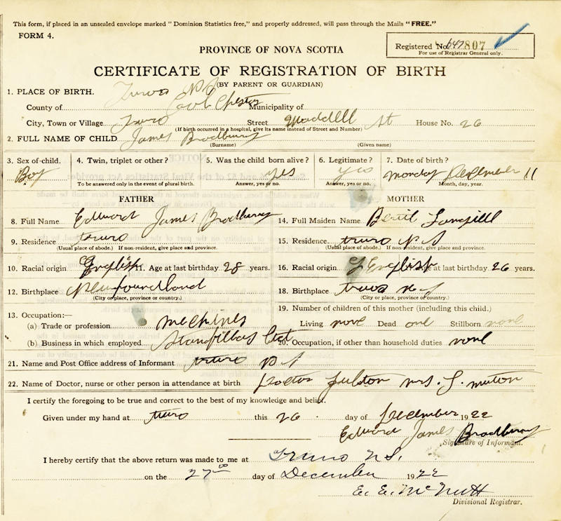 Parents Father: BRADBURY, James Eldred Mother: LANGILLE, Bertha Vertie Birth Born on December 11, 1922 in Truro, Colchester Co., NS Death Died on December 12, 1922 in Truro, Colchester Co., NS Buried in Truro, Colchester Co., NS Notes Death: Premature Birth Sources Nova Scotia Deaths: Book 62 Pg. 434 Images James Bradbury Birth James Bradbury Death