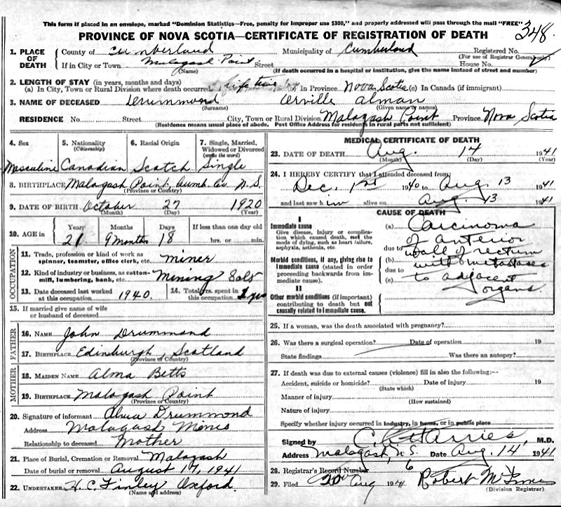 Parents Father: DRUMMOND, John Mother: BETTS, Myrtle Alma Birth Born on October 27, 1920 in Wallace, Cumberland Co., NS Death Died on August 14, 1941 in Malagash Point, Cumberland Co., NS Buried in Malagash United Church Cemetery Malagash,NS in Malagash, Cumberland Co., NS Notes Death: Carcinoma of Rectum Occupation: Salt Miner Sources Nova Scotia Deaths: Book 199 Pg. 348 Images Orville Drummond Birth Orville Drummond Orville Drummond Death