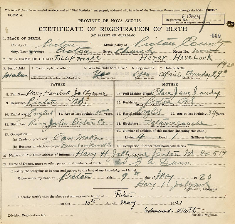 Parents Father: JOLLYMORE, Harry Havelock Mother: JOUDRIE, Clara Jane Birth Born on April 29, 1920 in Pictou, Pictou Co., NS Death Died on July 23, 1944 in New Glasgow, Pictou Co., NS Buried in Saint James Cemetery in Pictou, Pictou Co., NS Notes Occupation: Coal Miner Death: Cerebral Hemorhage Military Service: WW2 RC Army Sources Nova Scotia Deaths: Book 215 Pg. 751 Images Harry Jollymore Birth Harry Jollymore