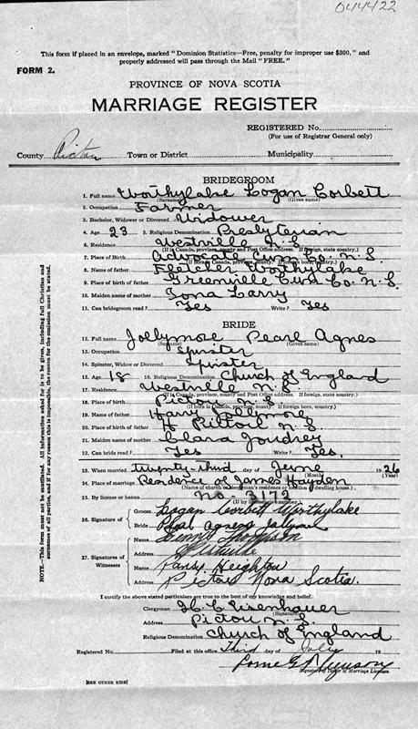 Birth Born on November 12, 1902 in Advocate Harbour, Cumberland Co., NS Death Died on December 24, 1963 in Westville, Pictou Co., NS Buried in Saint Bees Cemetery in Westville, Pictou Co., NS Marriages JOLLYMORE, Pearl Agnes Married on June 23, 1926 in Pictou, Pictou Co., NS Notes Occupation: Farmer/ Coal Miner Death: Cardio Vascular Renal Disease Military Service: WW2 RC Army Sources Nova Scotia Deaths: Year 1963 Pg. 7324 Images Logan Worthylake Pearl Jollymore Marriage