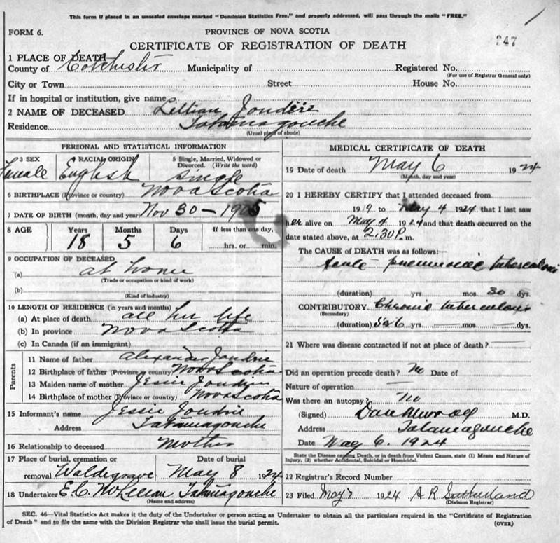 Parents Father: JOUDRIE, Alexander Mother: JOUDRIE, Jessie Anna Birth Born on November 30, 1905 in Tatamagouche, Colchester Co., NS Death Died on May 06, 1924 in Tatamagouche, Colchester Co., NS Buried in Bayview Cemetery in Waldegrave, Colchester Co., NS Notes Death: Acute Pneumomia Tuberculosis Sources Nova Scotia Deaths: Book 112 Pg. 347 Images Lillian Joudrie Death