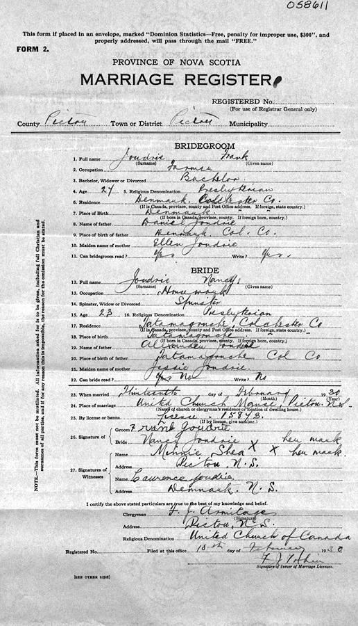 Parents Father: JOUDRIE, Alexander Mother: JOUDRIE, Jessie Anna Birth Born on February 26, 1907 in Tatamagouche, Colchester Co., NS Death Buried in Monument Hill Cemetery in Wallace Grant, Cumberland Co., NS Marriages HALVERSON, Martin W. Married on March 24, 1943 in Oxford, Cumberland Co., NS JOUDRIE, Frank Married on February 13, 1930 in Pictou, Pictou Co., NS Children JOUDRIE, Clarence S.: 1928 - 1997 HALVERSON, Nina Mae: July 31, 1944 - October 26, 2016 HALVERSON, Carl: 1951 - 1951 Images Nancy Joudrie Birth Wendell Langille Birth Martin & Nancy (Joudrie) & Carl Halverson Nancy Joudrie Marriage Nancy( Joudrie) Joudrie Marriage
