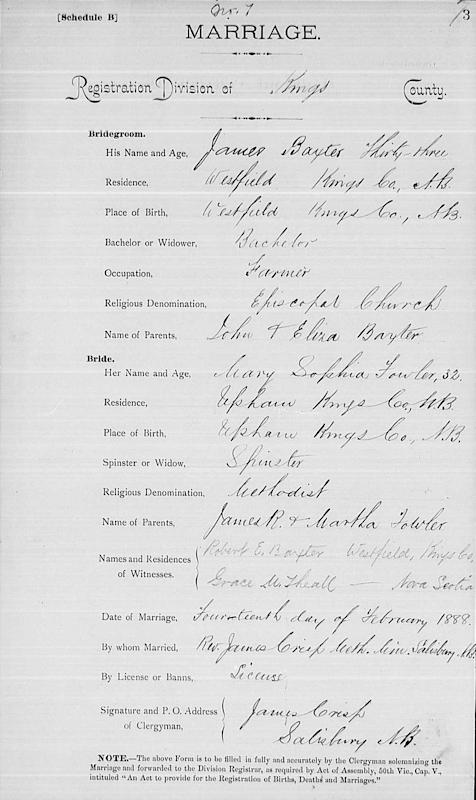 Parents Father: FOWLER, James Rulof Mother: FENWICK, Martha Birth Born on January 27, 1856 in Upham, Kings Co., NB Death Died on March 12, 1940 in Westfield Centre, Kings Co., NB Buried in Hardings Point Loyalist Cemetery in Hardings Point, Kings Co., NB Marriages BAXTER, James Married on February 14, 1888 in Westfield, Kings Co., NB Children BAXTER, James Fenwick: January 08, 1889 - July 18, 1908 BAXTER, Robert Henry: January 28, 1892 - February 01, 1990 BAXTER, Martha Grace: March 28, 1893 - September 13, 1911 BAXTER, Ruth: March 28, 1895 - December 14, 1973 BAXTER, Joseph Rulofson Fowler: April 30, 1899 - August 31, 1988 Notes Marriage Notice: m. At residence of bride's parents, 14th Feb., by Rev. James Crisp, James BAXTER, Westfield (Kings Co.) / Mary S. FOWLER youngest d/o James R. FOWLER, Esq., Upham Station (Kings Co.) The Daily Telegraph Saint John,NB February 17,1888 Death: Cerebral Hemorhage Sources NB Deaths: #26030 Images James & Mary (Fowler) & James F. & Martha Baxter Mary (Fowler) Baxter Death Mary Fowler Marriage Mary (Fowler) & James Baxter