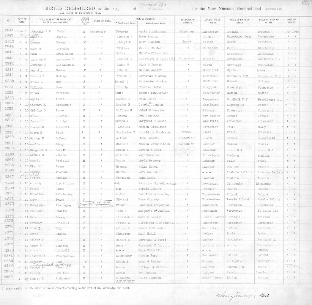 Parents Father: LOVELL, Frank Walter Mother: FISHER, Bertha A. Birth Born on June 10, 1917 in Worcester, Worcester Co., MA Death Died on July 03, 1995 in Worcester, Worcester Co., MA Buried in Hope Cemetery in Worcester, Worcester Co., MA Marriages BUCK, Donald E. Children BUCK, Judith M.: 1939 Sources Massachusetts Deaths: #050565 Images Margaret Lovell Birth
