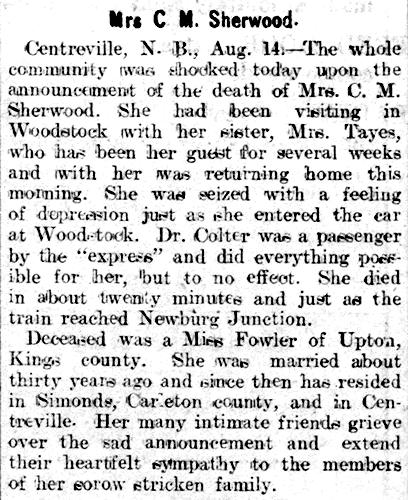 Parents Father: FOWLER, Daniel Mother: FOWLER, Amy Armanella Birth Born on January 14, 1845 in Upham, Kings Co., NB Death Died on August 14, 1903 in Newburg Junction, Carleton Co., NB Buried in Centreville United Baptist Church Cemetery in Centreville, Carleton Co., NB Marriages SHERWOOD, Charles Miles Married on May 08, 1871 in Upham, Kings Co., NB Children SHERWOOD, Ida Alberta: November 03, 1874 - October 19, 1931 SHERWOOD, Lena May: September 06, 1876 - April 24, 1958 Notes Death: Died On A Train Sources Newspaper Obituary: Telegraph-Journal Saint John,NB Aug 18,1903 Images Frances Fowler Marriage Frances (Fowler) Sherwood Obit Telegraph-Journal Saint John,NB Aug 18,1903