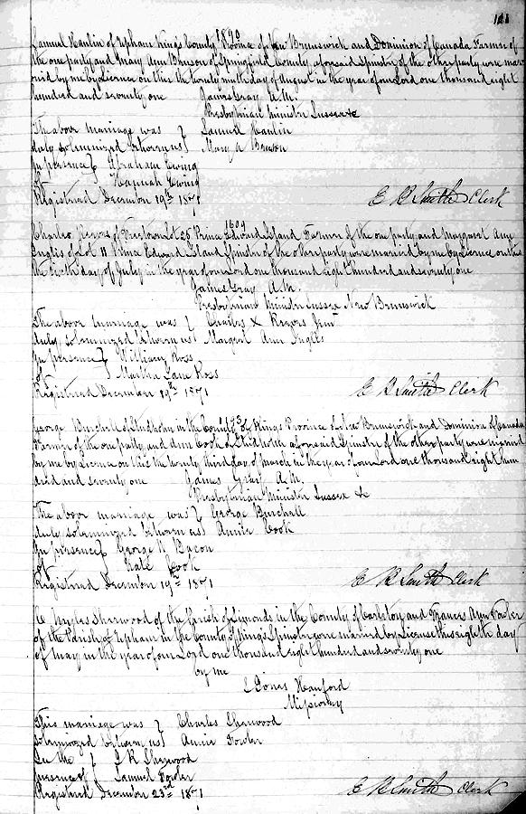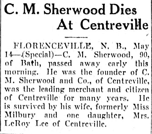 Parents Father: SHERWOOD, William Mother: McCREADY, Frances Caroline Birth Born on January 30, 1845 in Hammond, Kings Co., NB Death Died on May 14, 1935 in Bath, Carleton Co., NB Buried in Centreville United Baptist Church Cemetery in Centreville, Carleton Co., NB Marriages FOWLER, Frances Annie Married on May 08, 1871 in Upham, Kings Co., NB Children SHERWOOD, Ida Alberta: November 03, 1874 - October 19, 1931 SHERWOOD, Lena May: September 06, 1876 - April 24, 1958 Notes Occupation: Miller Mechant Death: Rheumatic Fever Sources NB Deaths: #1546 Images Charles Sherwood Death Frances Fowler Marriage Charles Sherwood Obit Times Globe Saint John,NB May 14,1935