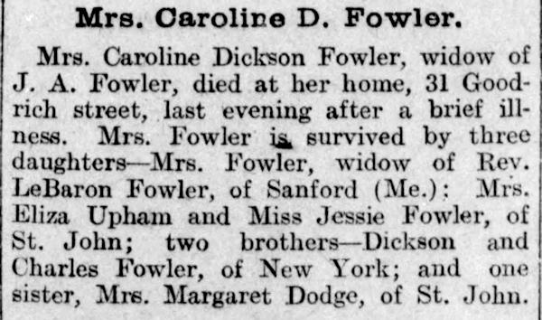 Parents Father: DICKSON, Joseph Mother: FAIRWEATHER, Sarah M. Birth Born on March 08, 1825 in Nauwigewauk, Kings Co., NB Death Died on November 13, 1907 in Saint John, Saint John Co., NB Buried in Cedar Hill Cemetery in Saint John, Saint John Co., NB Marriages FOWLER, Joseph Allen Married on January 18, 1849 in Kings Co., NB Children FOWLER, Sarah Ann: April 22, 1849 - July 26, 1919 FOWLER, Harriet Caroline: 1852 - December 23, 1875 FOWLER, Joseph Dixon: June 14, 1854 - May 16, 1934 FOWLER, Eliza: April 12, 1856 - December 24, 1933 FOWLER, Jessie Margaret: March 18, 1858 - December 02, 1941 FOWLER, Charles Gilbert: 1862 - 1947 Notes Death: Pulmonary Congestion Sources NB Deaths: Reg: 1894 Ref: C4/1907 Images Caroline (Dixon) Fowler Death Joseph A. Fowler Marriage Caroline (Dickson) Fowler Obit Telegraph-Journal Saint John,NB Nov 14,1907