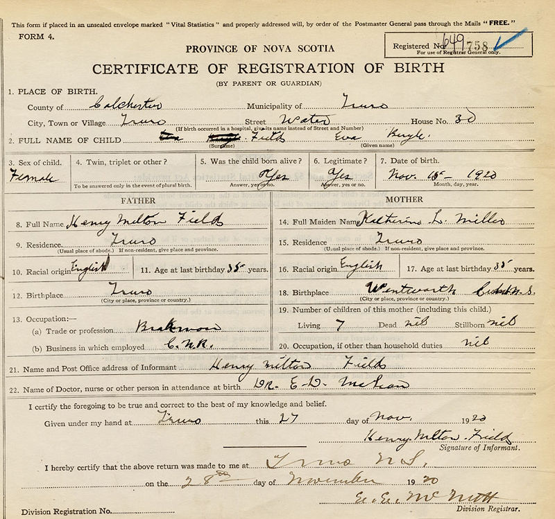 Parents Father: FIELDS, Henry Milton Mother: MILLER, Catherine Louise Birth Born on November 15, 1920 in Truro, Colchester Co., NS Death Died on September 06, 2007 in Hilden, Colchester Co., NS Buried in Watson Cemetery in Salmon River, Colchester Co., NS Marriages TAYLOR, Fred Laurence Married on December 10, 1937 in Truro, Colchester Co., NS Children TAYLOR, Cytheria TAYLOR, Susan TAYLOR, Fred Laurence TAYLOR, Lewis Stanley: July 26, 1940 - March 05, 1944 TAYLOR, Carolyn Connie L.: 1947 TAYLOR, Richard Allan: July 07, 1948 - March 29, 2009 Notes Obituary: Halifax Herald September 8,2007 TAYLOR (Fields), Eva M. - 86, formerly of Valley Road, Valley, Colchester Co., passed away September 6, 2007, in Val's Rest Home, Hilden, where she received the best of care in a loving environment. Born in Truro, she was the daughter of the late Henry and Catherine (Miller) Fields. Eva worked as a machine operator at Standfield's Ltd., Truro until her retirement. Eva loved to knit, quilt, and cook, especially for her family, playing Bingo, spending time with her grandchildren and traveling became her favorite interests in later years. She is survived by daughters, Cytheria (Richard) Thorne, Scarborough, Ont.; Carolyn (Connie) Taylor, Truro; Susan (Maynard) Simpson, Economy; sons, Fred Jr. "Marshall" (Marilyn), Truro; Richard (Gail), Camden; several grandchildren, great-grandchildren, and two great great-grandchildren. She was predeceased by her husband of 63 years, Fred L. Taylor; son, Louis; sisters, Edith, Hazel, Evelyn; brothers, Ralph, Percy and George. Cremation has taken place under the direction of Mattatall Funeral Home, Truro. A family graveside service will be held on Monday at 2 p.m. with Rev. Kaj Binderup officiating in Watson Cemetery, Truro. Occupation: Machine Operator Stanfield's Ltd Sources Colchester Cemeteries: Watson Cemetery Salmon River,NS Images Eva Fields Birth Fred & Eva (Fields) & Lewis & Carolyn Taylor Fred & Eva (Fields) Taylor Marriage Eva Fields
