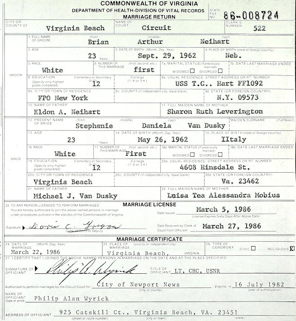 Birth Born on September 29, 1962 in Nebraska, USA Marriages VANDUSKY, Stephanie Daniela Married on March 22, 1986 in Virginia Beach, VA Notes Military Service: US Navy Images Stephanie Van Dusky Marriage